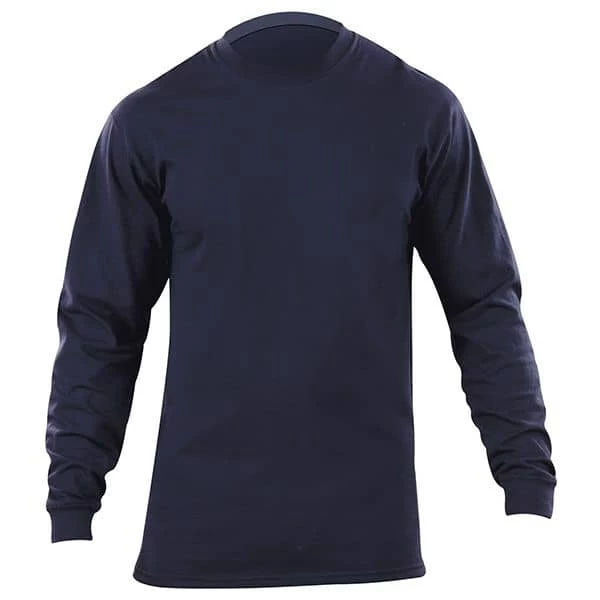 The 5.11 company has built a reputation for producing top-quality gear to support military personnel, law enforcement officers, and firefighters on the job. One of the most popular choices among firefighting professionals worldwide, few tops offer better comfort and durability than the 5.11 Tactical Long Sleeve Station Tee (Fire Navy). This rugged garment from 5.11 features a tapered fit and extended length, ensuring that you stay tucked in all day. Moisture-wicking technology fights wetness while the printed inner label prevents chafing at the back of your neck. The L/S Station Tee is built from jersey knit cotton and can be silkscreen printed or embroidered if desired. A spandex ribbed crewneck provides flexible comfort, and a high-density, no-roll collar means you always look smart and professional. Finally, trust the double-needle stitching for durability that’ll keep this shirt coming back for more.