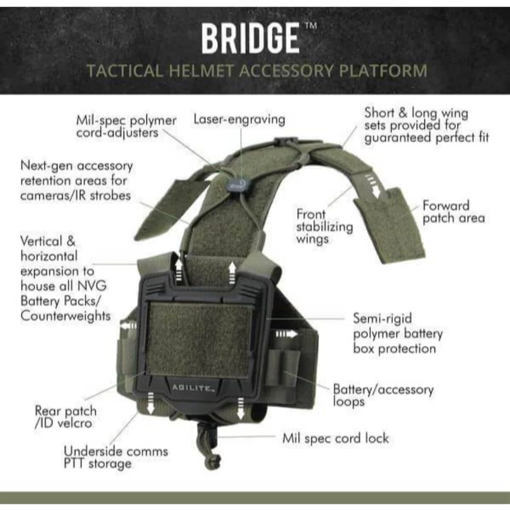 The Agiliteâ„¢ Tactical Helmet Bridgeâ„¢ Accessory Platform protects your helmet from damage while providing secure management of your tech, gear, and accessories. A full-spectrum platform gives you easy access to your accessories, while integrated channels ensure low-profile, snag-free cable management. A proprietary rear pouch protects your spare Night Vision Goggle (NVG) battery from impact, while VELCRO and Mil-Spec bungee cord keep your mission-essential gear secured. The Agiliteâ„¢ Tactical Helmet Bridgeâ„¢ Accessory Platform is universal and can be attached to any helmet with external VELCRO.