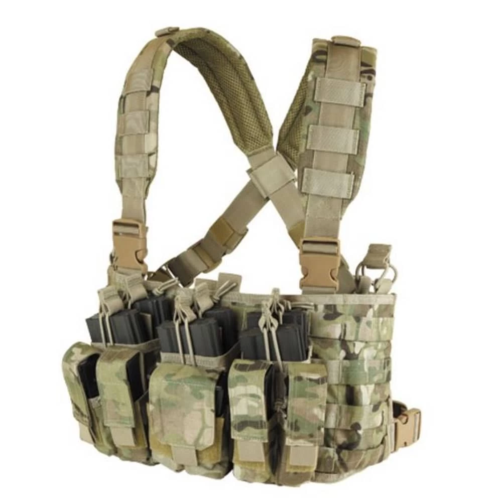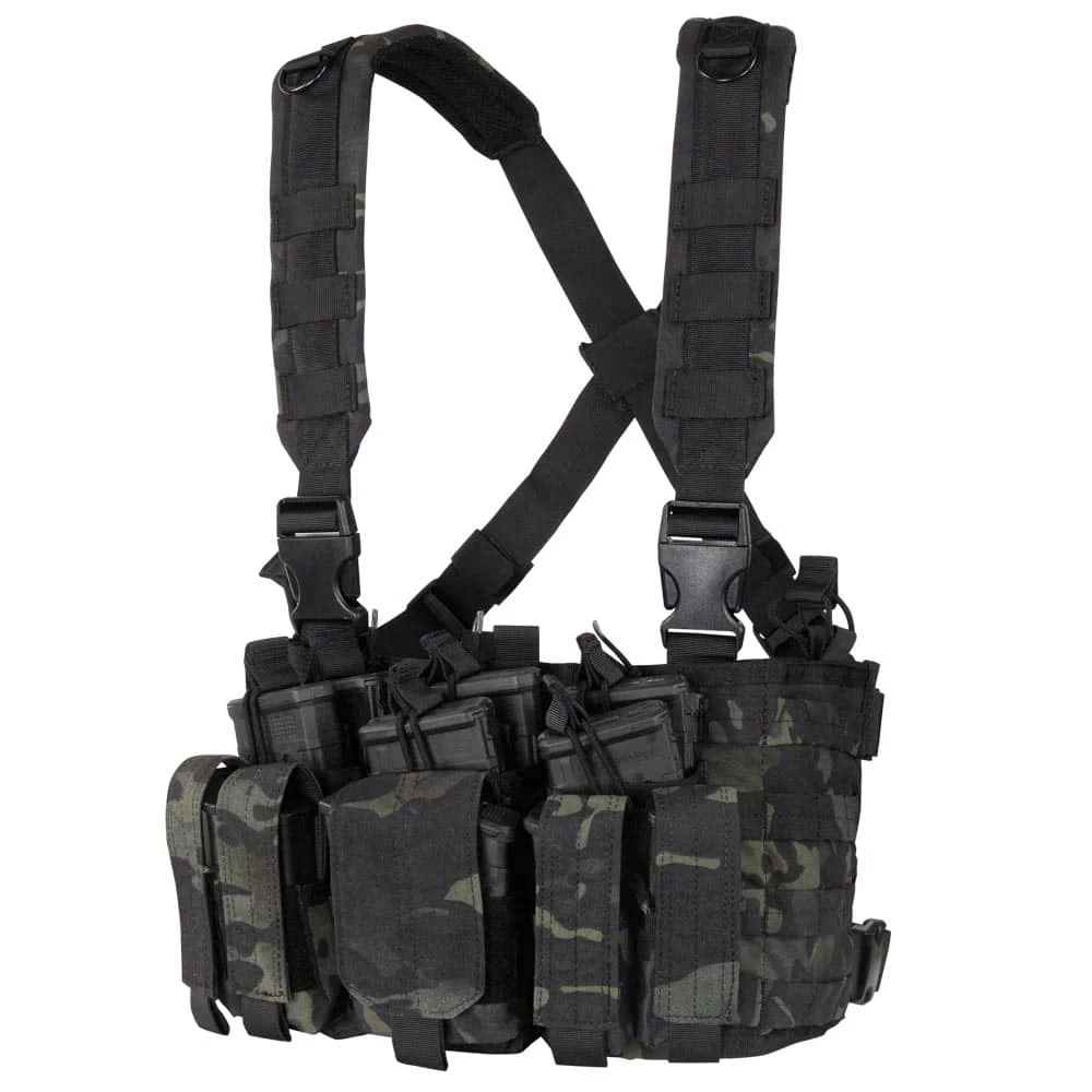 This Condor Chest Rig features a cross-back design with padded shoulder straps and adjustable waist for evenly distributed load. With external MOLLE, loop panels, and d-rings, this tactical chest rig allows virtually limitless customization.