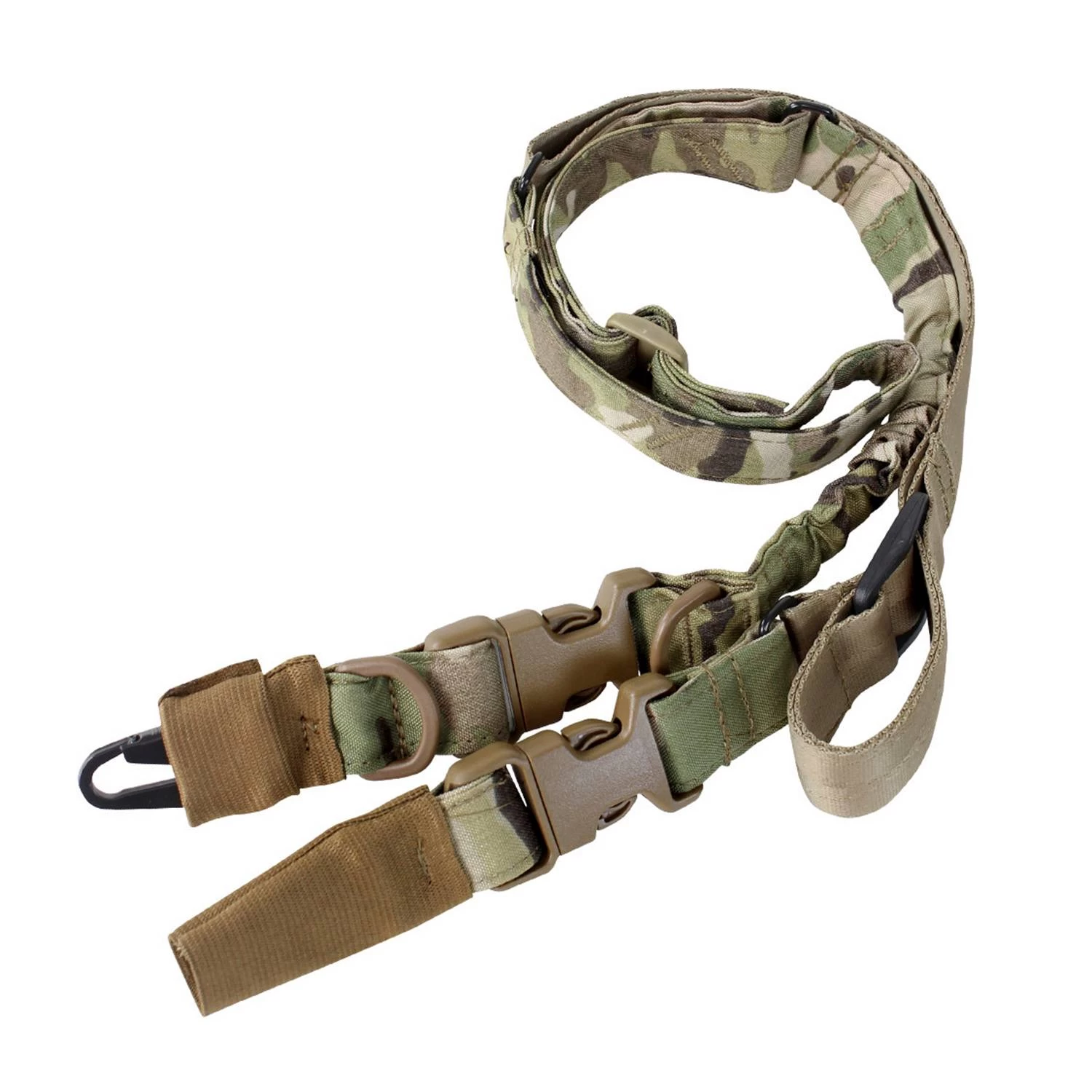 The Condor Stryke Single Bungee Conversion Sling was designed for anyone looking for adaptability in the field. Made of 1¼ inch webbing with inner elastic bungee this sling can quickly convert from a two-point sling into a single point, adapting to any weapon and style of carry you need for the mission you’re on. The HK snap hook adapter is covered with an elastic sleeve to dampen noise, and the side release buckles make it simple to release your weapon when it is no longer needed for the situation.