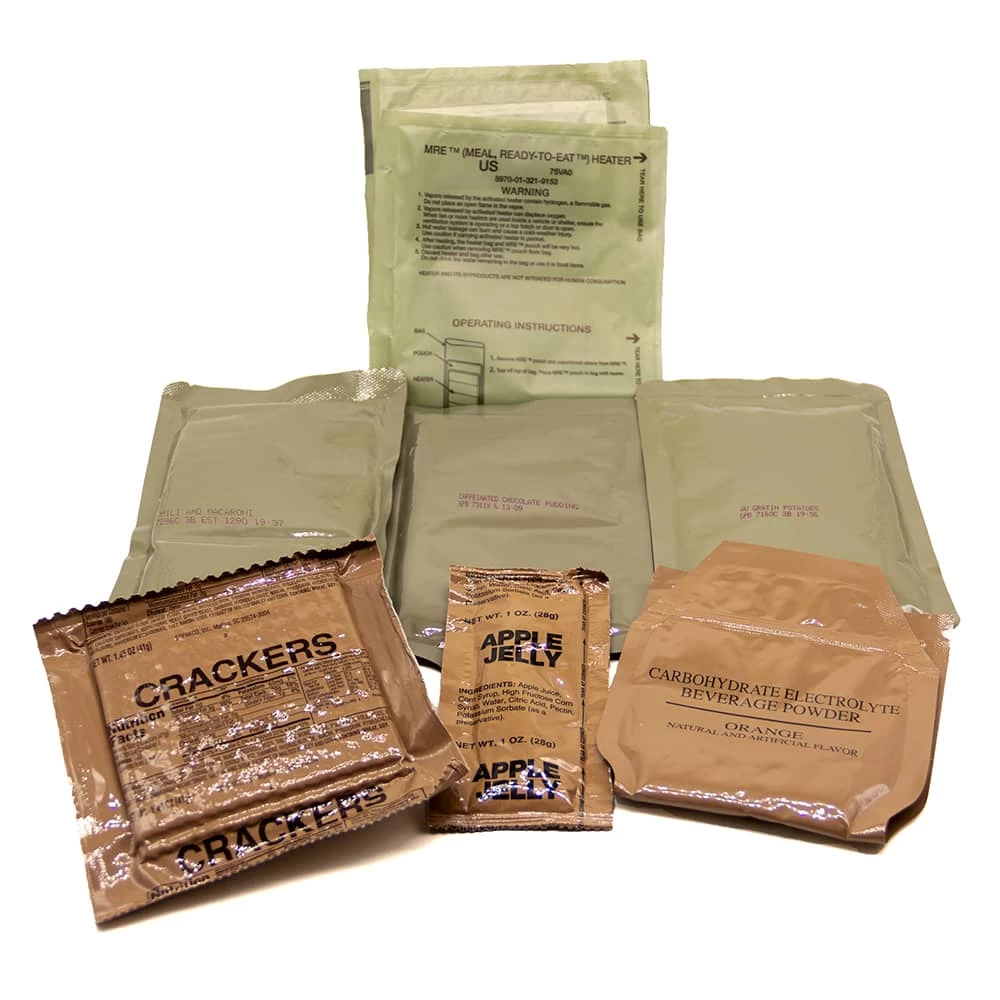 - Each meal includes an entree, side dish, dessert, crackers, spread, beverage, coffee, condiments, utensil and a water activated heating system