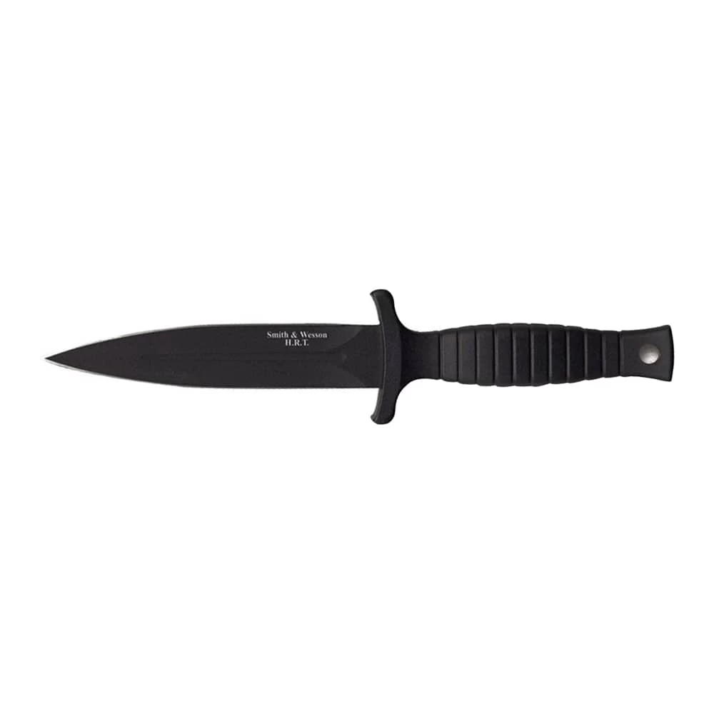 The Smith & Wesson HRT Spear Point Fixed Blade Boot Knife features a black Blade made from corrosion resistant high carbon stainless-steel. A double-edged spear point dagger Blade gives the HRT boot knife ambidextrous capabilities. A TPE rubber wrapped handle with lanyard hole and black leather sheath with snap strap, the Smith and Wesson HRT knife is the ultimate concealed carry weapon.