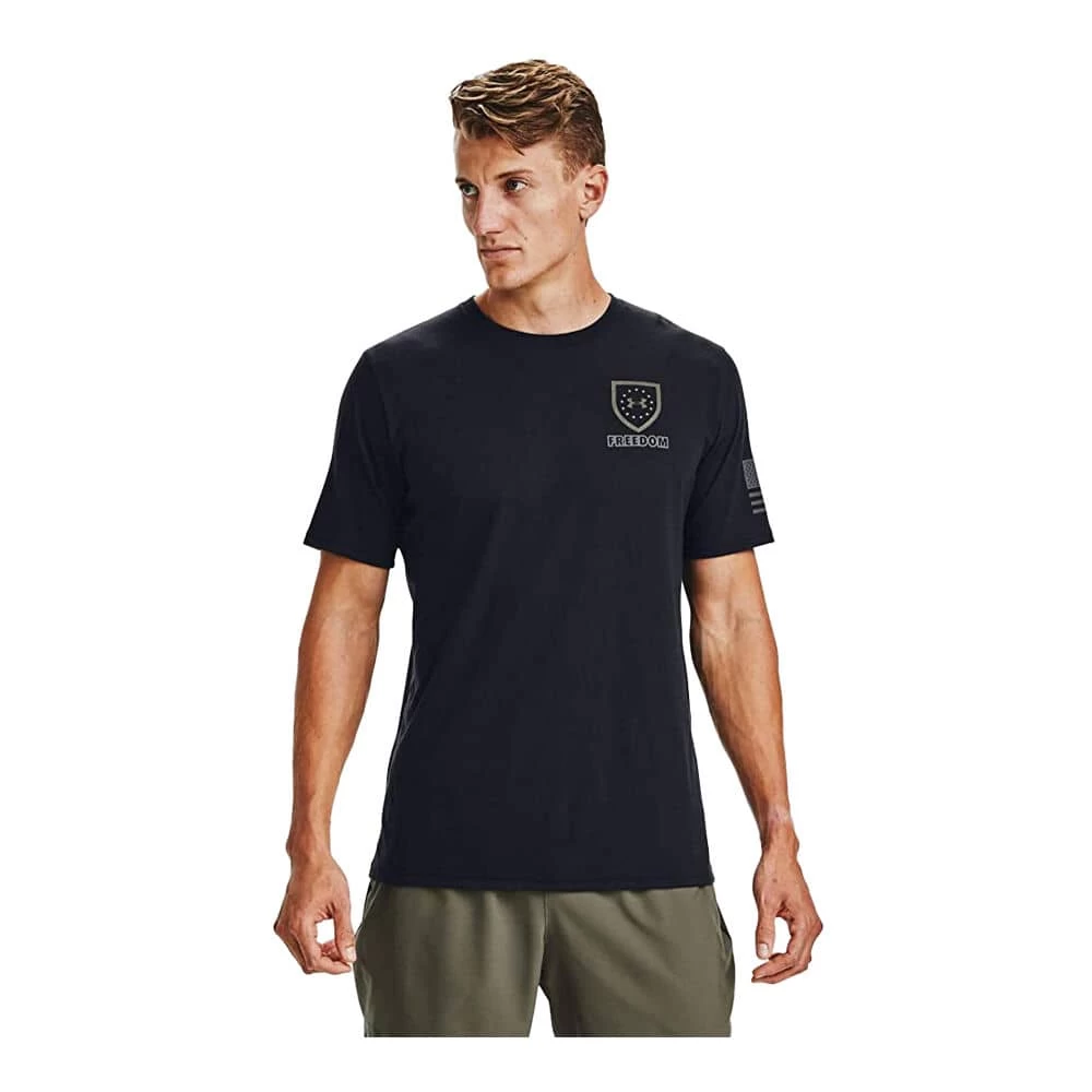 Let freedom fly with the Under Armour UA Freedom Eagle T-Shirt. This patriot graphic t-shirt from Under Armour features a freedom eagle on the back with the famous stars and bars included in the design. On the left sleeve is a reverse american flag, and the left chest features a shield with 13 stars representing the 13 original colonies. The shirt is a super soft, comfortable blend of 87% polyester and 13% elastane. Order yours today!